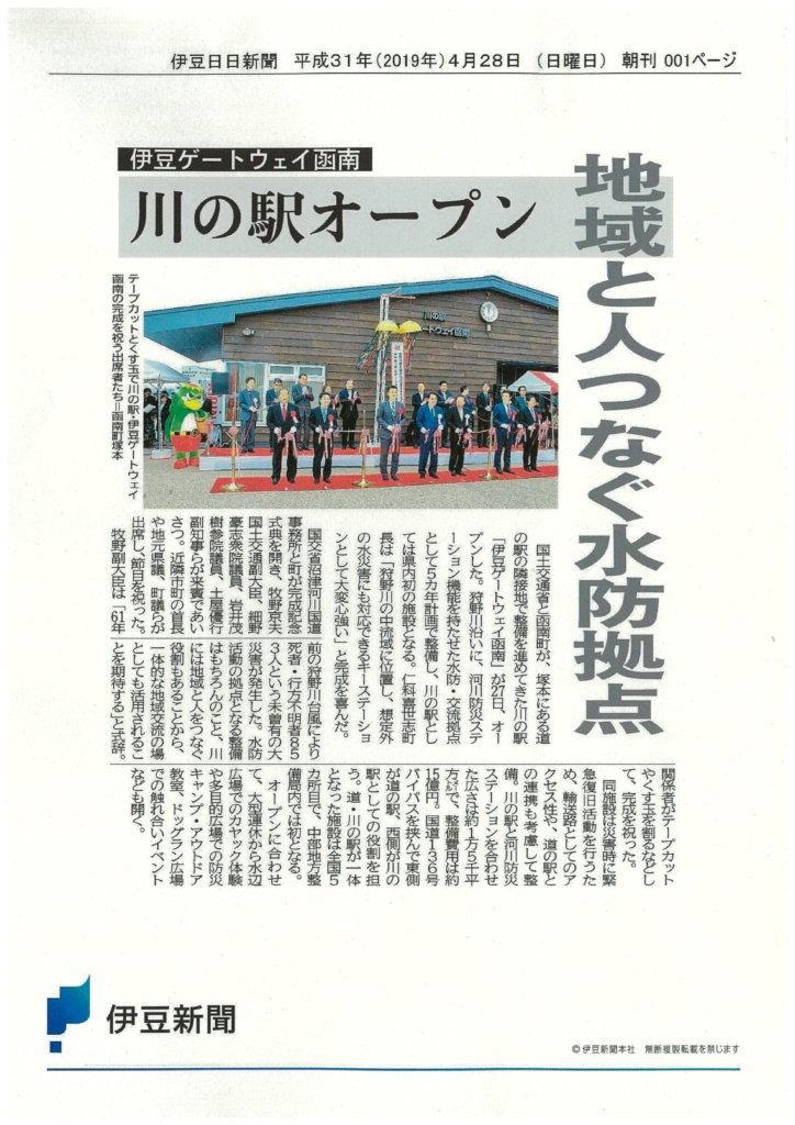 川の駅「伊豆ゲートウェイ函南」完成式 2021 9/14 新聞 2019年4月28日2021年9月14日 伊豆日日新聞より 新聞 川の駅 道の駅でラジオ出演 関連記事 仁科氏 2800票差で再選 2022年3月28日 函南町長 仁科氏再選 2022年3月28日 函南町長選 立候補者の横顔 2022年3月23日 函南町長選 現職仁科氏が出馬表明 2021年12月1日 犯罪抑止に貢献 – 所有地にカメラ 2021年11月10日 10月23日 保健現場にICT活用 2021年10月23日 10月2日 「仁田ふじさん」開園 2021年10月2日 8月14日 アジアの鉄人室伏さん 函南町に寄贈 2021年8月14日