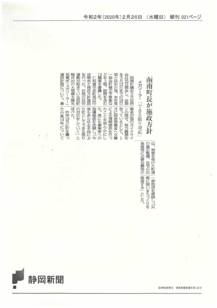施政方針演説でメガソーラーに対し「できる限り対応」 2021 8/25 新聞 2020年2月26日2021年8月25日 静岡新聞より 新聞 社会福祉大会でごあいさつ 自衛隊入隊予定者の皆さんと 関連記事 仁科氏 2800票差で再選 2022年3月28日 函南町長 仁科氏再選 2022年3月28日 函南町長選 立候補者の横顔 2022年3月23日 函南町長選 現職仁科氏が出馬表明 2021年12月1日 犯罪抑止に貢献 – 所有地にカメラ 2021年11月10日 10月23日 保健現場にICT活用 2021年10月23日 10月2日 「仁田ふじさん」開園 2021年10月2日 8月14日 アジアの鉄人室伏さん 函南町に寄贈 2021年8月14日