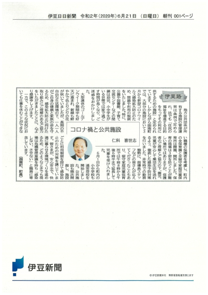 コロナ禍と公共施設 2021 8/25 新聞 2020年6月21日2021年8月25日 「伊豆路」伊豆日日新聞より 新聞 自衛隊入隊予定者の皆さんと 地域密着金融機関の連続受賞 関連記事 仁科氏 2800票差で再選 2022年3月28日 函南町長 仁科氏再選 2022年3月28日 函南町長選 立候補者の横顔 2022年3月23日 函南町長選 現職仁科氏が出馬表明 2021年12月1日 犯罪抑止に貢献 – 所有地にカメラ 2021年11月10日 10月23日 保健現場にICT活用 2021年10月23日 10月2日 「仁田ふじさん」開園 2021年10月2日 8月14日 アジアの鉄人室伏さん 函南町に寄贈 2021年8月14日
