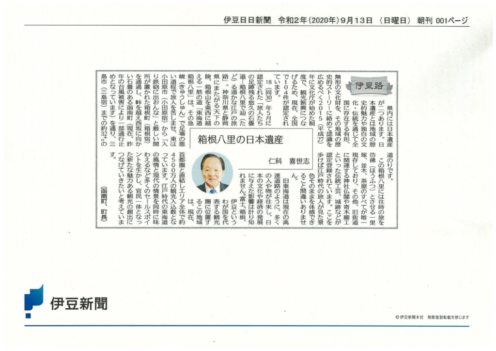 箱根八里の日本遺産 2021 8/28 新聞 2020年9月13日2021年8月28日 「伊豆路」伊豆日日新聞より 新聞 防災訓練 令和元年 東日本台風から1年 関連記事 仁科氏 2800票差で再選 2022年3月28日 函南町長 仁科氏再選 2022年3月28日 函南町長選 立候補者の横顔 2022年3月23日 函南町長選 現職仁科氏が出馬表明 2021年12月1日 犯罪抑止に貢献 – 所有地にカメラ 2021年11月10日 10月23日 保健現場にICT活用 2021年10月23日 10月2日 「仁田ふじさん」開園 2021年10月2日 8月14日 アジアの鉄人室伏さん 函南町に寄贈 2021年8月14日