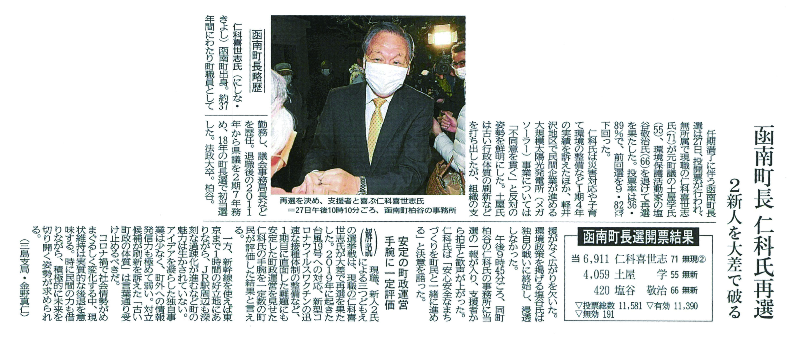 函南町長 仁科氏再選 2022 4/14 新聞 2022年3月28日2022年4月14日 新聞 函南町長選 立候補者の横顔 仁科氏 2800票差で再選 関連記事 仁科氏 2800票差で再選 2022年3月28日 函南町長選 立候補者の横顔 2022年3月23日 函南町長選 現職仁科氏が出馬表明 2021年12月1日 犯罪抑止に貢献 – 所有地にカメラ 2021年11月10日 10月23日 保健現場にICT活用 2021年10月23日 10月2日 「仁田ふじさん」開園 2021年10月2日 8月14日 アジアの鉄人室伏さん 函南町に寄贈 2021年8月14日 8月14日 待機児童施設 開所 2021年8月14日